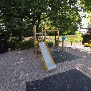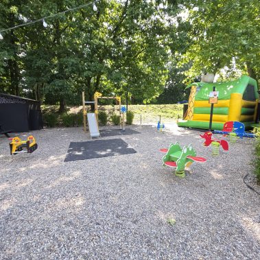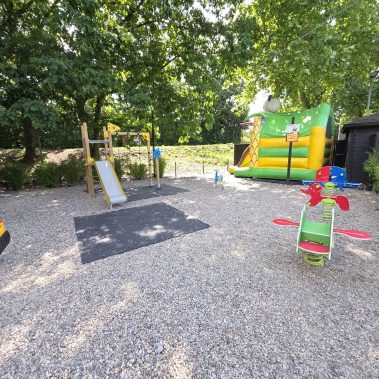 - Weicher Kiesboden und schattenspendende Bäume für angenehmes Spielen